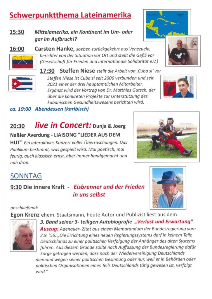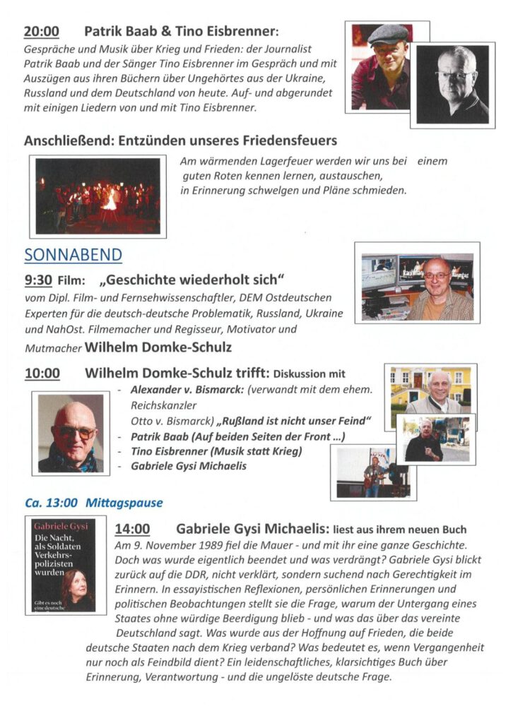 mit unseren Denkfesten der Aktiven haben wir uns vorgenommen, uns zu bestärken, zu motivieren, zusammenzuführen und Mut zu geben. An den Gründen unseres Treffens, nämlich Waffenhandel, Geschichtsfälschung, Krieg, politische Verdummung, Ausgrenzung zu bekämpfen und damit die Notwendigkeit unseres Einsatzes für Diplomatie, Völkerfreundschaft, Solidarität und Frieden hat sich nichts geändert. Die jüngsten Wahlen zum deutschen Bundestag haben gezeigt: der Weg, auf den wir uns begeben haben hin zu Humanismus, Solidarität und Frieden ist lang. Wie wohltuend kraftspendend es ist, Menschen zu treffen, die ähnlich denken oder einfach in offenen Gesprächen nach der Wahrheit und Friedenslösungen suchen, haben wir alle schon erfahren. Allerdings oft auch zufällig! Also, kommt an den Tisch unter Kiefernbäumen … lasst uns die Tradition dieses Festes fortführen, bei dem wir, die aktiv Suchenden, uns ein Wochenende lang kennenlernen, Kunst erleben, Gespräche führen, uns neuen Mut geben und vernetzen.