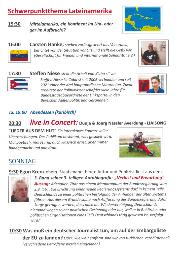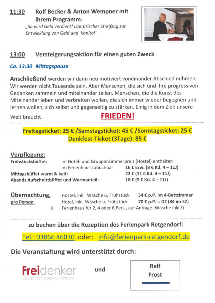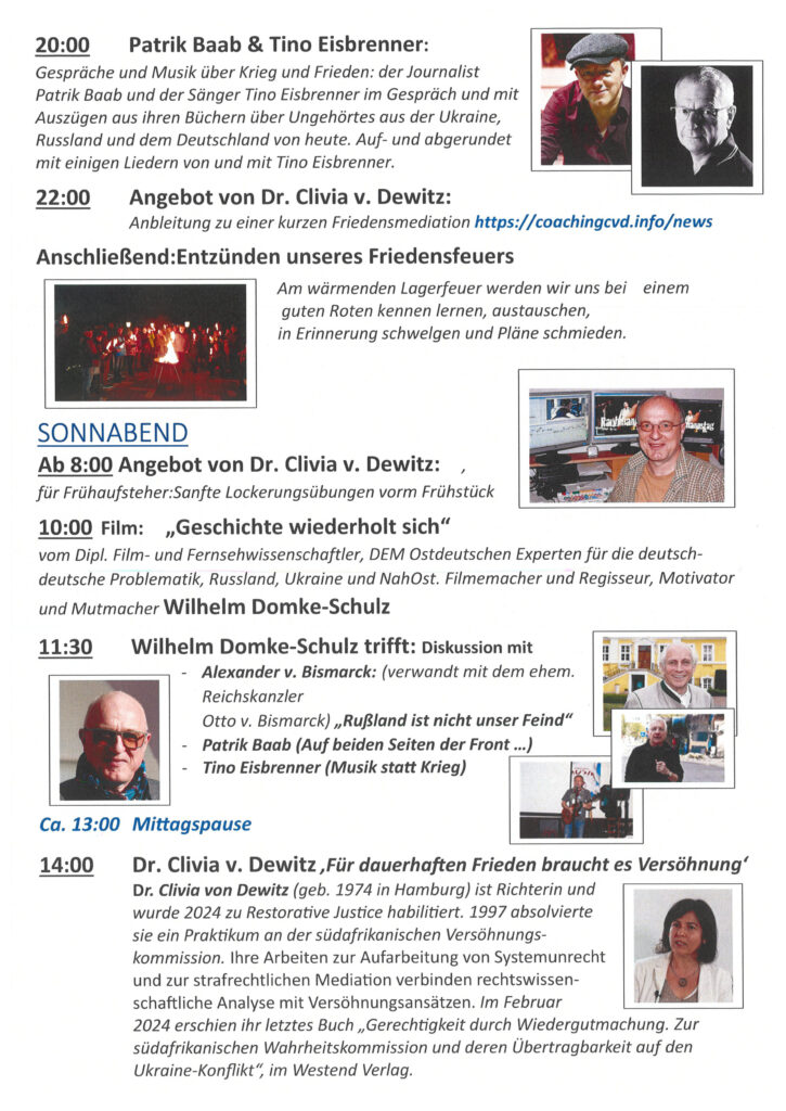 mit unseren Denkfesten der Aktiven haben wir uns vorgenommen, uns zu bestärken, zu motivieren, zusammenzuführen und Mut zu geben. An den Gründen unseres Treffens, nämlich Waffenhandel, Geschichtsfälschung, Krieg, politische Verdummung, Ausgrenzung zu bekämpfen und damit die Notwendigkeit unseres Einsatzes für Diplomatie, Völkerfreundschaft, Solidarität und Frieden hat sich nichts geändert. Die jüngsten Wahlen zum deutschen Bundestag haben gezeigt: der Weg, auf den wir uns begeben haben hin zu Humanismus, Solidarität und Frieden ist lang. Wie wohltuend kraftspendend es ist, Menschen zu treffen, die ähnlich denken oder einfach in offenen Gesprächen nach der Wahrheit und Friedenslösungen suchen, haben wir alle schon erfahren. Allerdings oft auch zufällig! Also, kommt an den Tisch unter Kiefernbäumen … lasst uns die Tradition dieses Festes fortführen, bei dem wir, die aktiv Suchenden, uns ein Wochenende lang kennenlernen, Kunst erleben, Gespräche führen, uns neuen Mut geben und vernetzen.